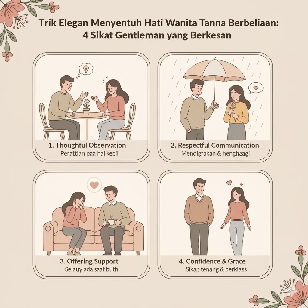 Menyentuh hati wanita tidak membutuhkan tindakan ekstrem. Justru keanggunan, ketulusan, perhatian sederhana, kemampuan mendengarkan, serta sikap dewasa adalah trik elegan yang meninggalkan kesan dalam. Ketika dilakukan tanpa berlebihan, semua itu menciptakan kenyamanan dan kehangatan emosional yang membuat wanita mudah membuka hati.