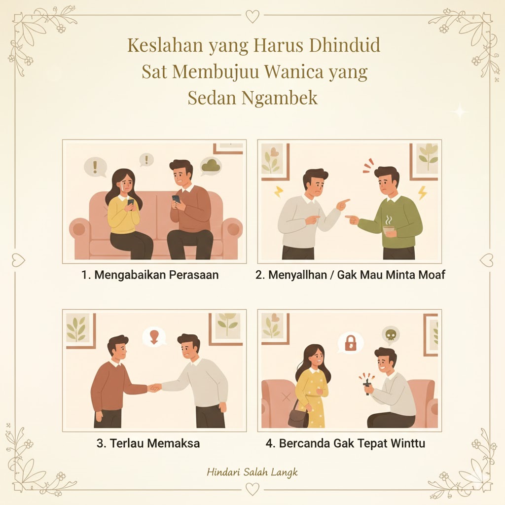 Membujuk wanita yang sedang ngambek memang tidak selalu mudah. Banyak pria melakukan berbagai cara untuk memperbaiki suasana, tetapi tidak semuanya tepat. Kadang, niat baik justru membuat masalah semakin panjang karena dilakukan dengan cara yang keliru. Untuk itu, penting mengetahui kesalahan apa saja yang harus dihindari agar proses membujuk berjalan lebih mulus. Dengan pendekatan yang tepat, hubungan bisa tetap harmonis tanpa konflik berlarut-larut.